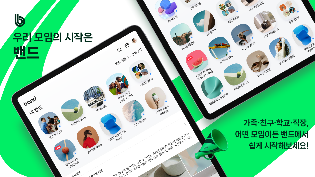 네이버밴드는 많은 인원이 참여할 수 있는 커뮤니티 서비스로, 학교 모임, 동호회, 회사 팀 등 다양한 규모의 모임 운영에 활용할 수 있습니다.