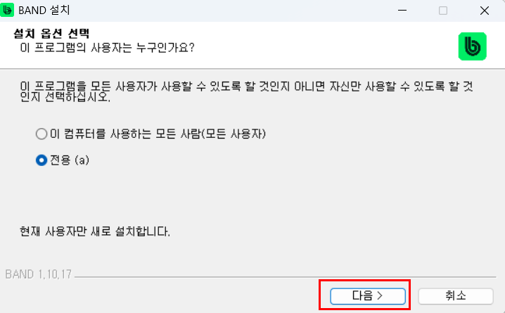 1. 네이버밴드 설치 파일을 다운로드 받은 후 실행하고 다음 >을 클릭합니다.
